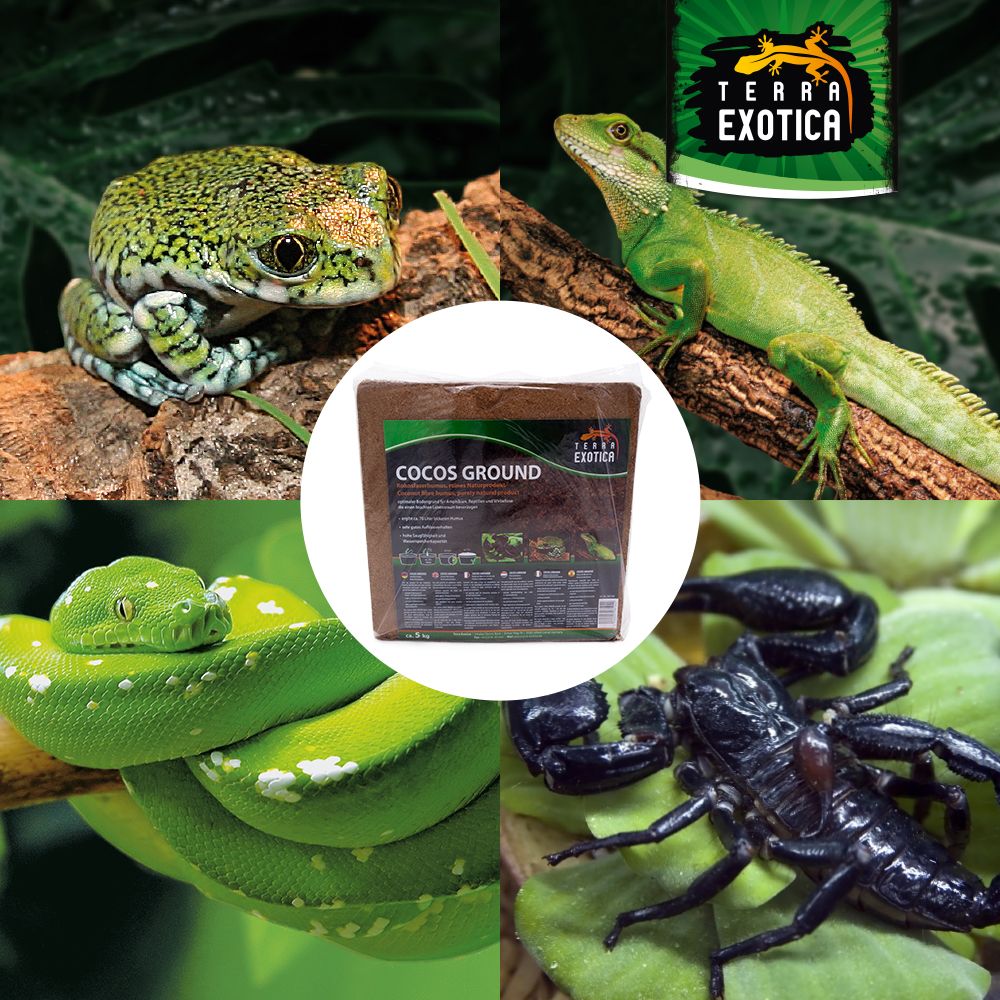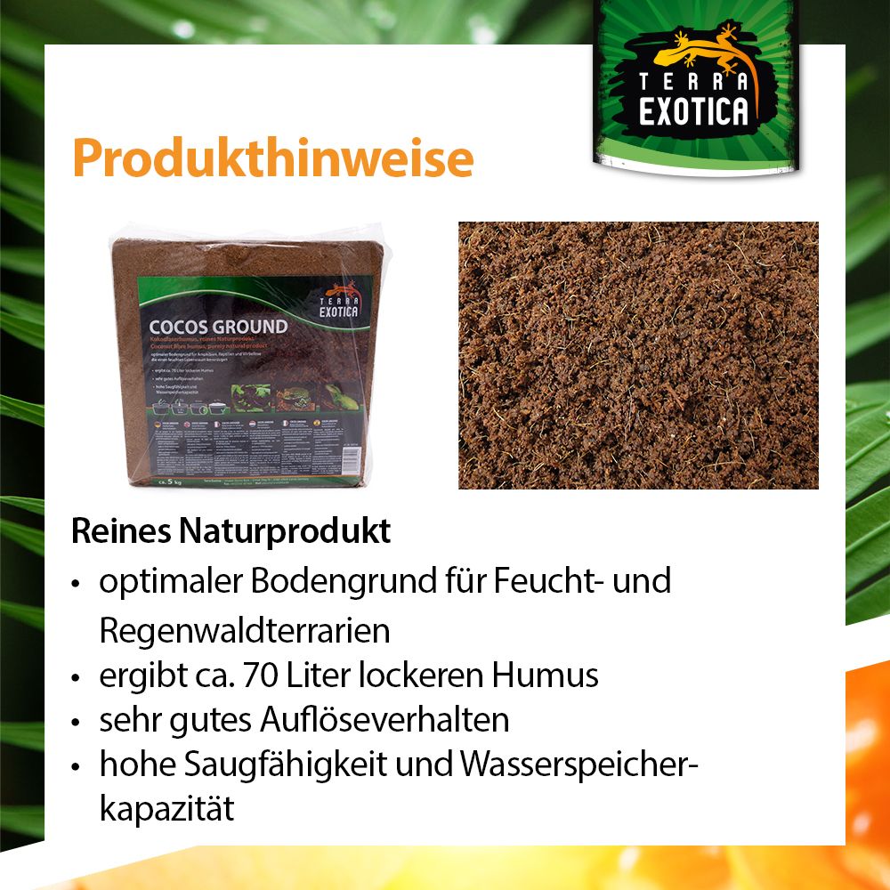 Der Terra Exotica Cocos Ground – Fein ist ein 100 % natürliches Substrat aus gepressten Kokosfasern und bildet den idealen Bodengrund für Feucht- und Regenwaldterrarien. Mit Wasser aufgequollen ergibt der Block ca. 75 Liter lockeren Humus, der sich hervorragend für Amphibien, Reptilien und Wirbellose eignet, die einen feuchten Lebensraum bevorzugen.