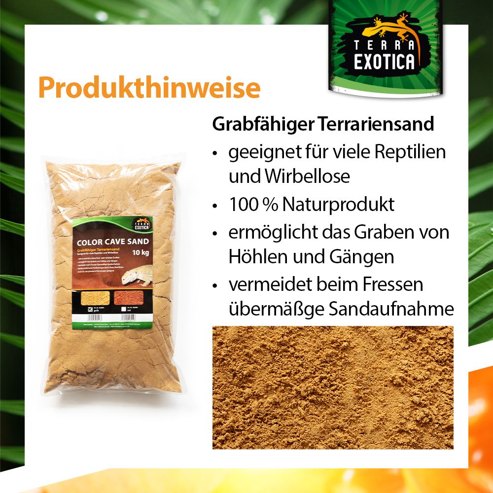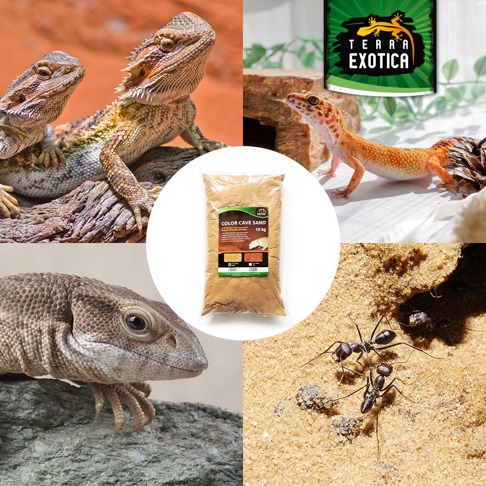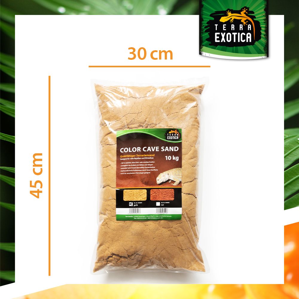 Der Terra Exotica Color Cave Sand – Gelb ist ein 100 % natürliches Substrat, das speziell für grabende Reptilien, Wirbellose und Kleinsäuger entwickelt wurde. Ohne Farb- oder Zusatzstoffe ermöglicht der Sand das Anlegen von Höhlen, Gängen und Gräben, wodurch das natürliche Grabverhalten der Tiere gefördert wird.