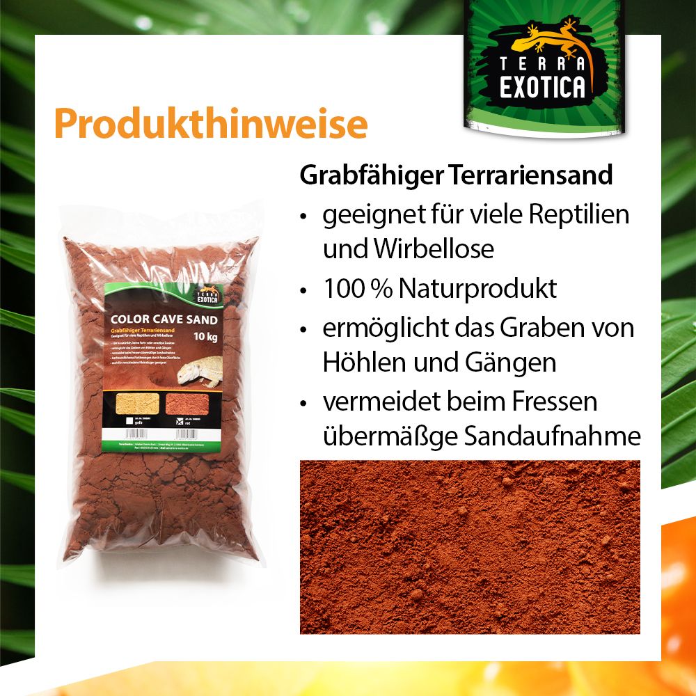 Der Terra Exotica Color Cave Sand – Rot ist ein 100 % natürliches Substrat, das speziell für grabende Reptilien, Wirbellose und Kleinsäuger entwickelt wurde. Ohne Farb- oder Zusatzstoffe ermöglicht der Sand das Anlegen von Höhlen, Gängen und Gräben, wodurch das natürliche Grabverhalten der Tiere gefördert wird.