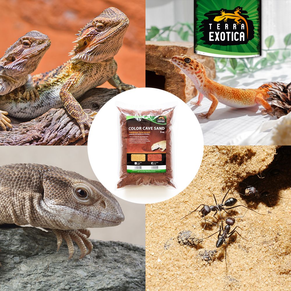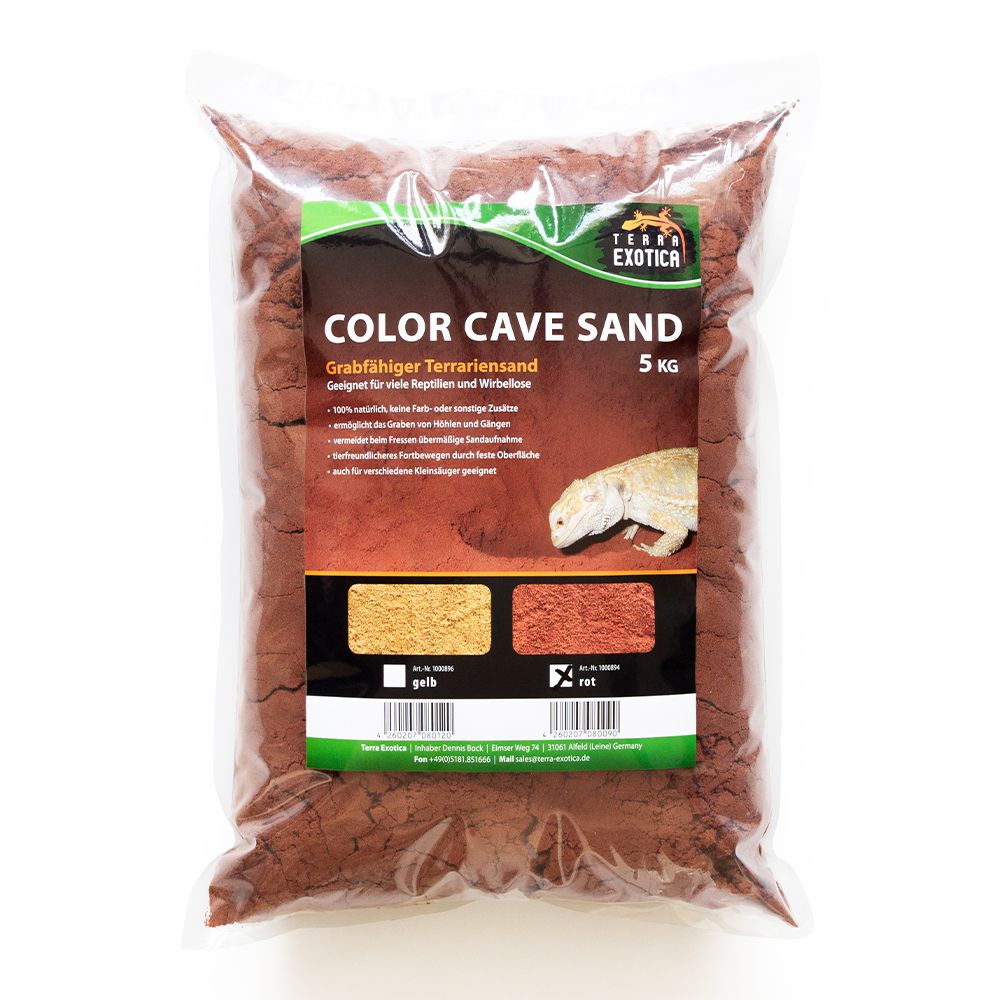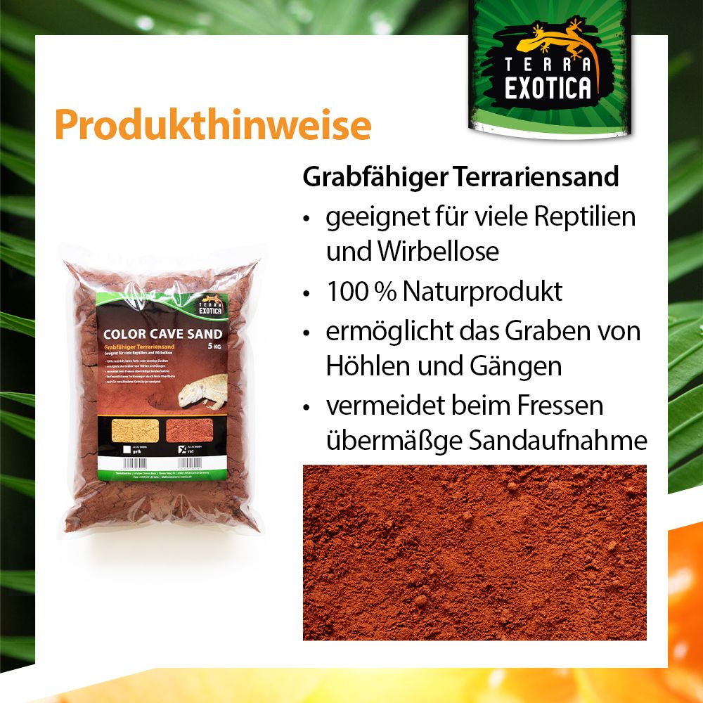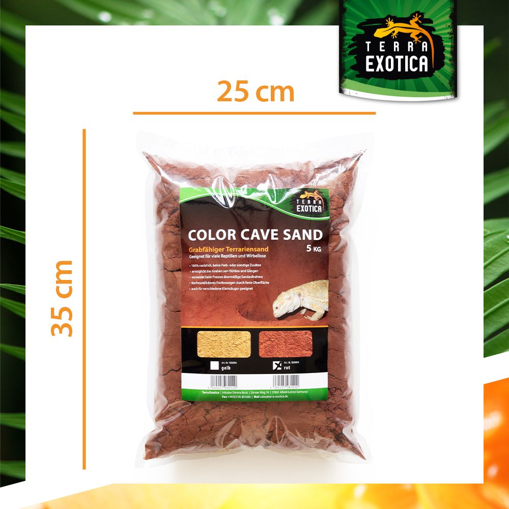 Der Terra Exotica Color Cave Sand – Rot ist ein 100 % natürliches Substrat, das speziell für grabende Reptilien, Wirbellose und Kleinsäuger entwickelt wurde. Ohne Farb- oder Zusatzstoffe ermöglicht der Sand das Anlegen von Höhlen, Gängen und Gräben, wodurch das natürliche Grabverhalten der Tiere gefördert wird.