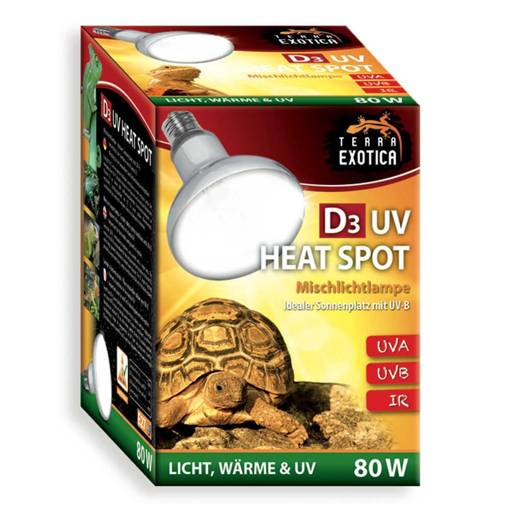 Der D3 UV Heat Spot (80-125 Watt) ist eine hochwertige UV-B Mischlichtlampe zur Schaffung eines natürlichen Sonnenplatzes im Terrarium. Sie kombiniert Wärme, Helligkeit und UV-B-Strahlung in einer Lampe und unterstützt damit die Gesundheit und Entwicklung von Reptilien optimal.