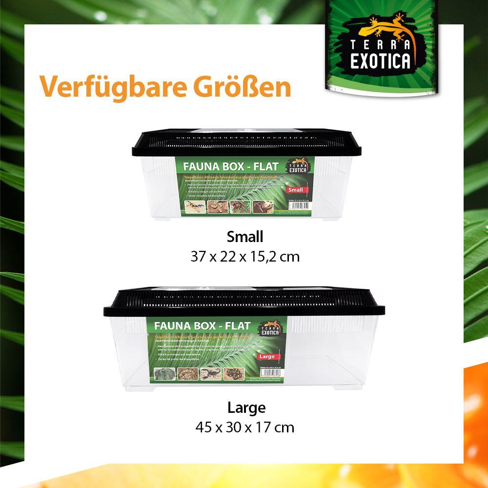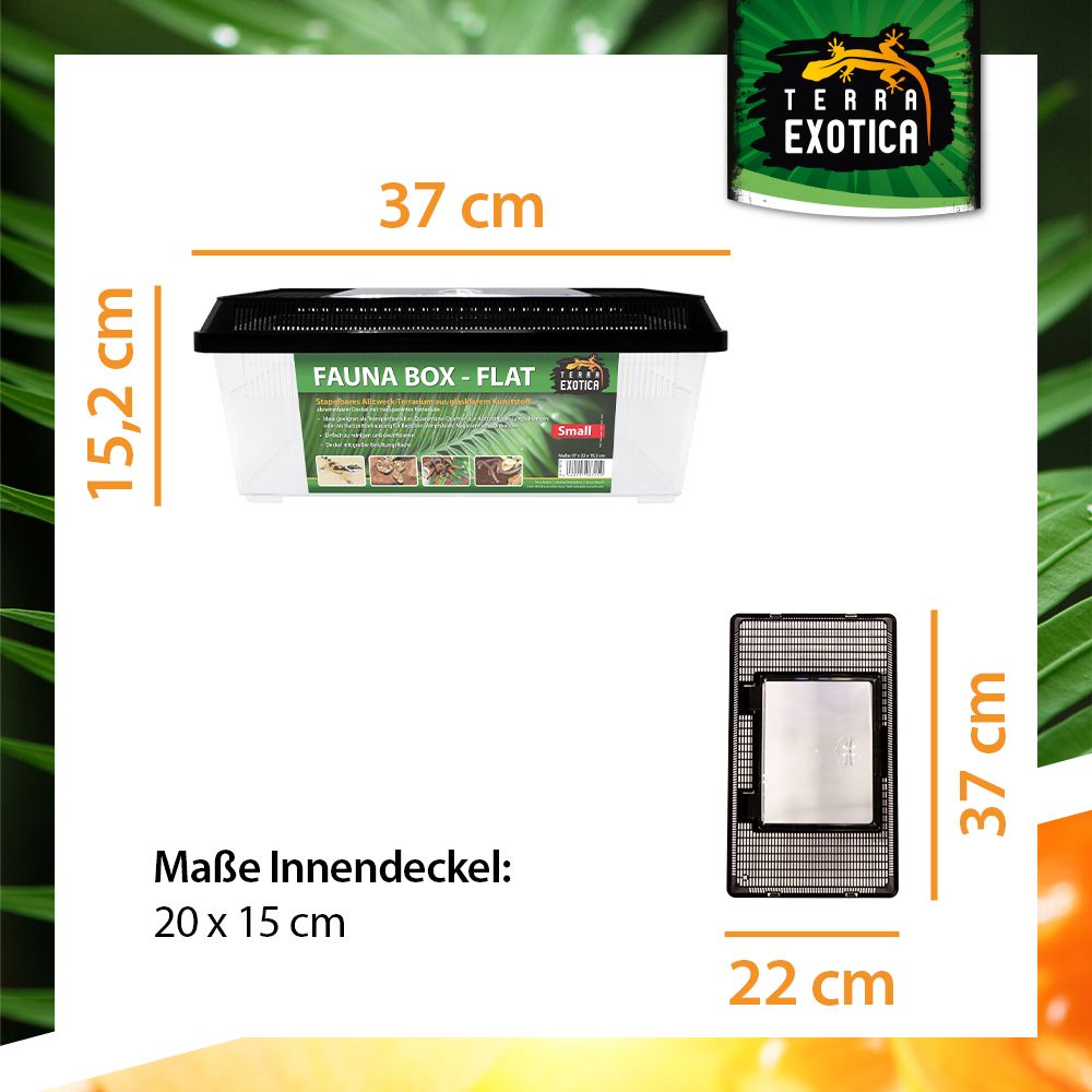 Die Fauna Box Flat Small (37 × 22 × 15,2 cm) ist ein vielseitiges, stapelbares Kunststoff-Terrarium, das optimale Bedingungen für die Haltung, Zucht und den Transport verschiedenster Tierarten bietet. Sie überzeugt durch Stabilität, Funktionalität und einfache Handhabung – ideal für den privaten und professionellen Einsatz in der Terraristik.
