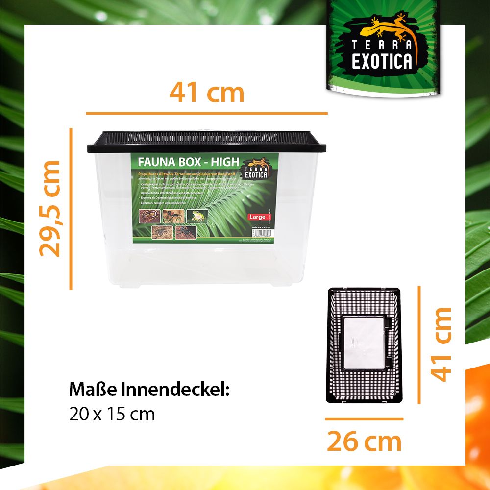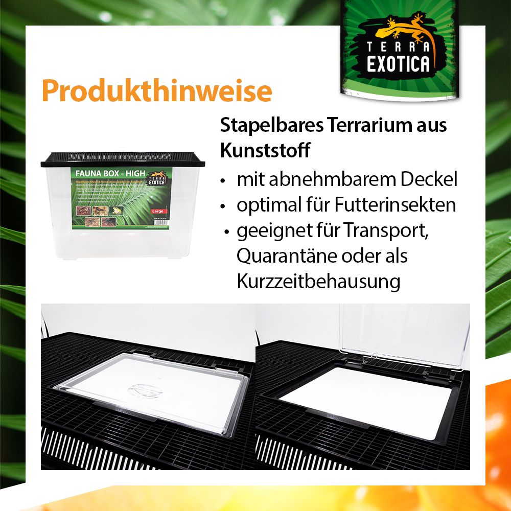 Die Fauna Box High Large (41 × 26 × 29,5 cm) ist ein vielseitiges, stapelbares Kunststoff-Terrarium, das optimale Bedingungen für die Haltung, Zucht und den Transport verschiedenster Tierarten bietet. Sie überzeugt durch Stabilität, Funktionalität und einfache Handhabung – ideal für den privaten und professionellen Einsatz in der Terraristik.