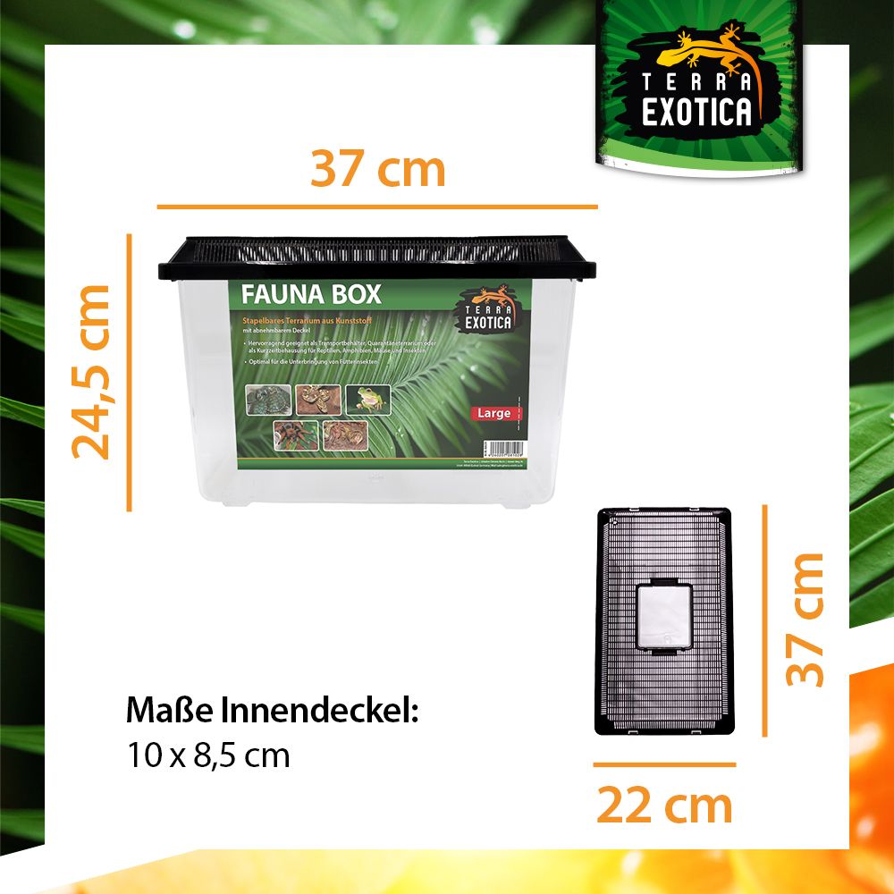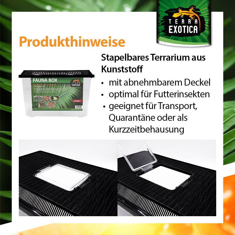 Die Fauna Box Large (37 × 22 × 24,5 cm) ist ein vielseitiges, stapelbares Kunststoff-Terrarium, das optimale Bedingungen für die Haltung, Zucht und den Transport verschiedenster Tierarten bietet. Sie überzeugt durch Stabilität, Funktionalität und einfache Handhabung – ideal für den privaten und professionellen Einsatz in der Terraristik.