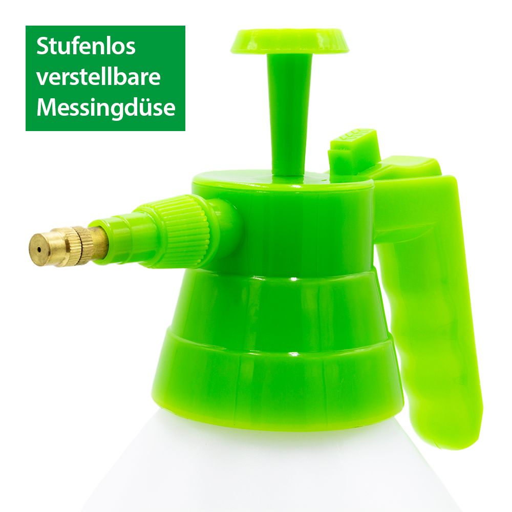 Dank des einstellbaren Messingsprühkopfes kann der Sprühnebel stufenlos reguliert werden – vom gezielten Strahl bis zum feinen Nebel. Der integrierte Verschlussmechanismus ermöglicht ein Sprühen ohne Unterbrechung.