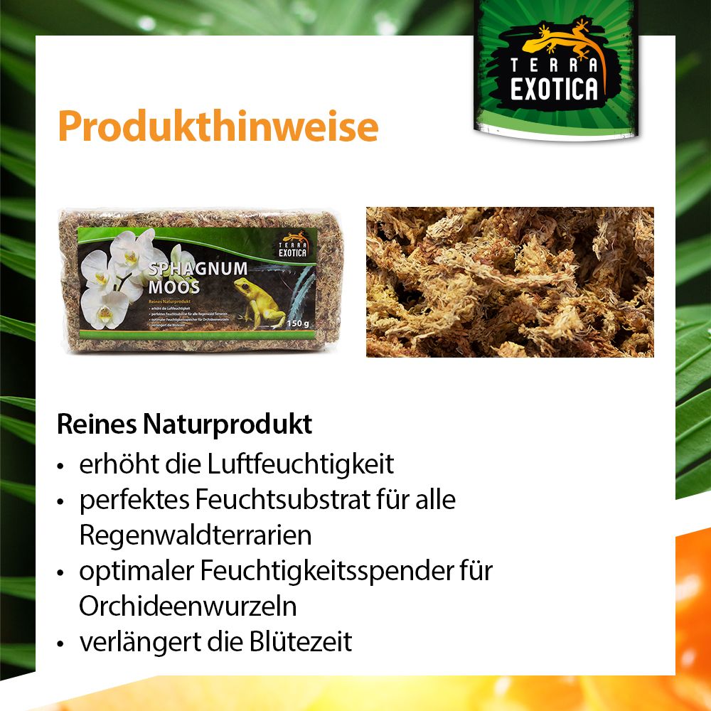 Das Moos erhöht die Luftfeuchtigkeit im Terrarium, dient als Feuchtigkeitsspender für Pflanzenwurzeln (z. B. Orchideen) und verlängert die Blütezeit. Dank seiner antibakteriellen und antibiotischen Eigenschaften ist es hygienisch, frei von Düngemitteln und Pestiziden, und eignet sich zudem als Eiablagesubstrat für Reptilien oder zur Überwinterung von Terrarientieren.