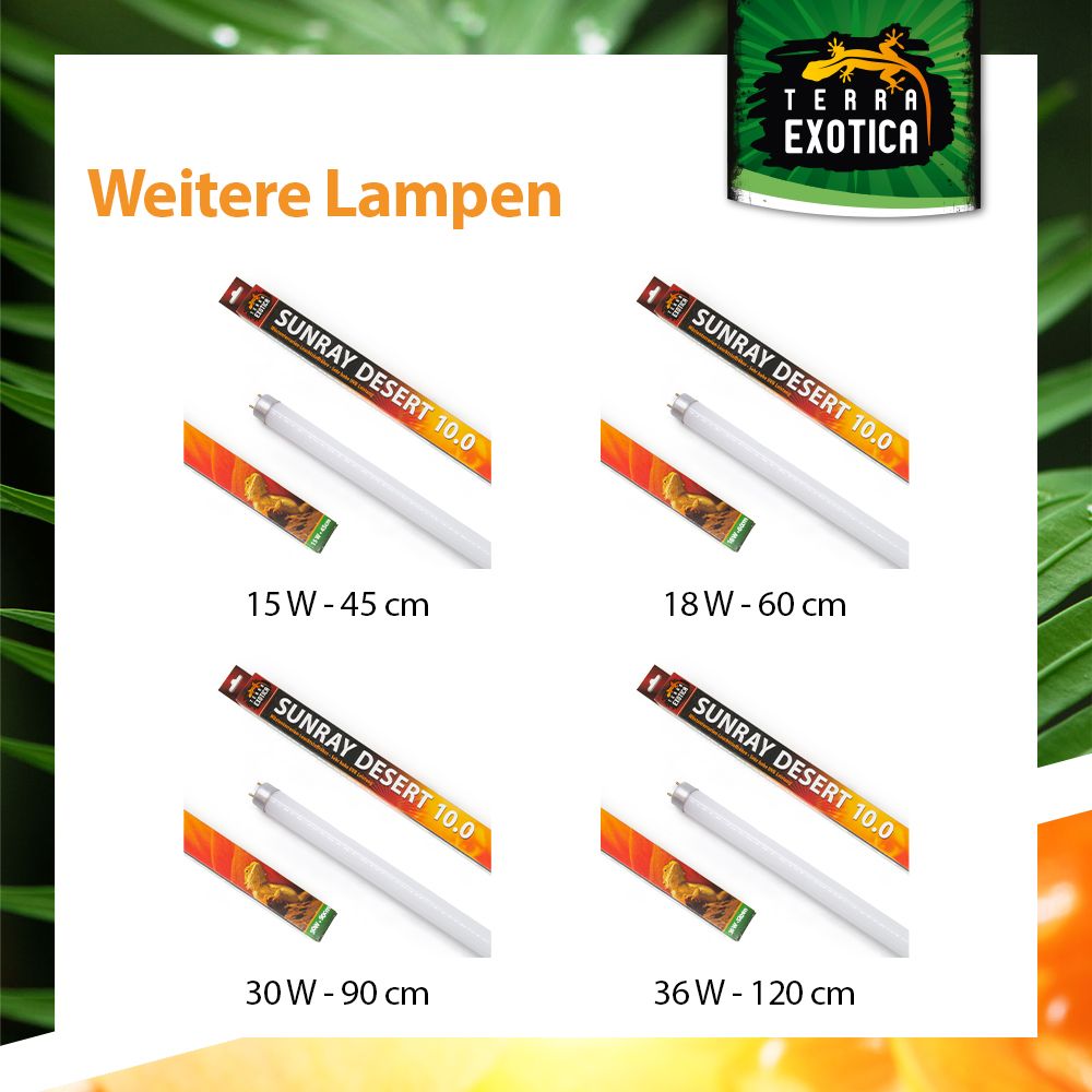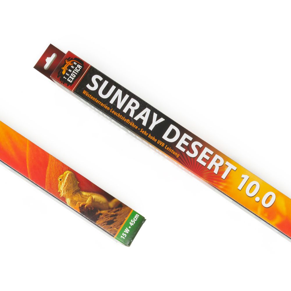 Die Terra Exotica Sunray Desert UV 10.0 ist eine Vollspektrum-Terrarien-Leuchtstoffröhre mit hohem UV-B-Anteil, die speziell für Wüsten- und Steppenbewohner entwickelt wurde. Sie liefert eine intensive UV-B-Strahlung, die für die Vitamin-D₃-Synthese und damit für einen gesunden Calciumstoffwechsel unverzichtbar ist. So wird Rachitis und anderen stoffwechselbedingten Knochenerkrankungen effektiv vorgebeugt.