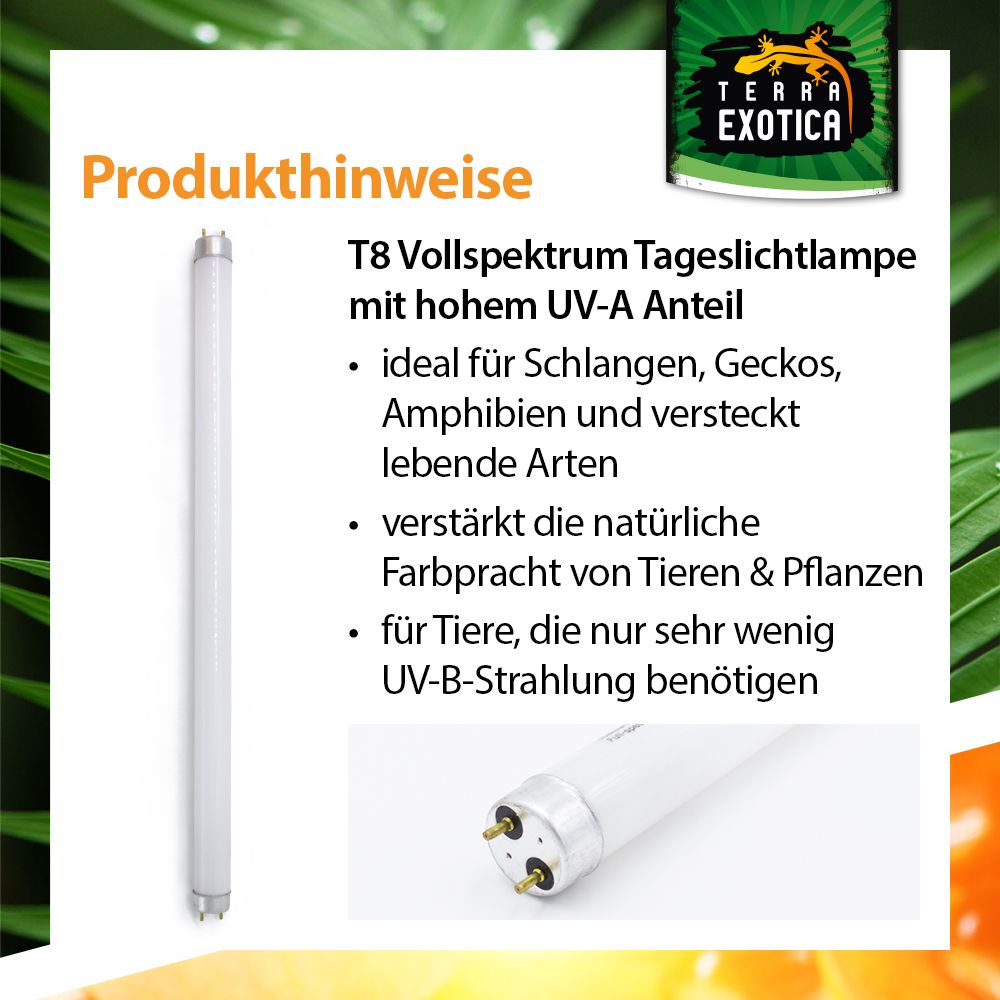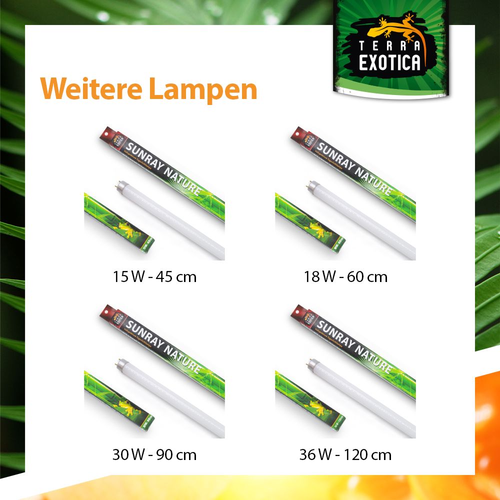 Die Terra Exotica Sunray Nature ist eine Vollspektrum-Terrarien-Leuchtstoffröhre, die gezielt die natürliche Farbenpracht deiner Tiere und Pflanzen betont. Durch ihre hohe UV-A-Strahlenleistung fördert sie das Wohlbefinden, die Aktivität und das Fortpflanzungsverhalten von Reptilien und Amphibien. Gleichzeitig unterstützt sie ein gesundes Pflanzenwachstum und sorgt für ein helles, naturnahes Lichtspektrum im Terrarium.